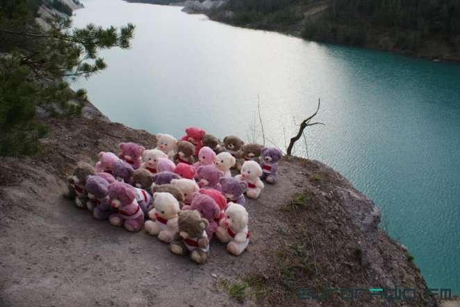 На фото видно, как на берегу карьера, заполненного водой, сидят несколько десятков игрушечных медвежат в БЧБ-одежде.
