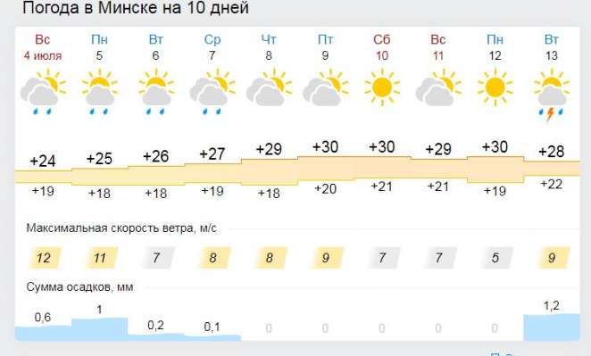 Согласно предварительным прогнозам синоптиков, 8 и 9 июля воздух в Минске прогреется до 29-30 градусов тепла. В южных регионах столбик термометров поднимется еще выше.