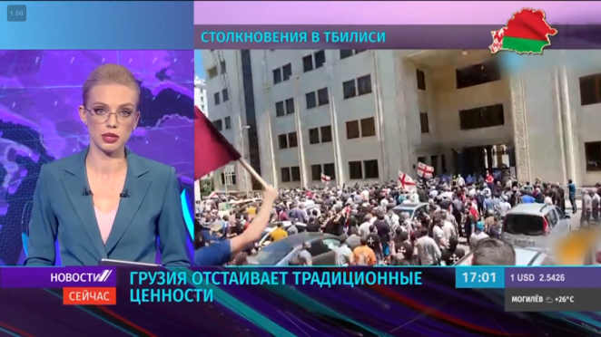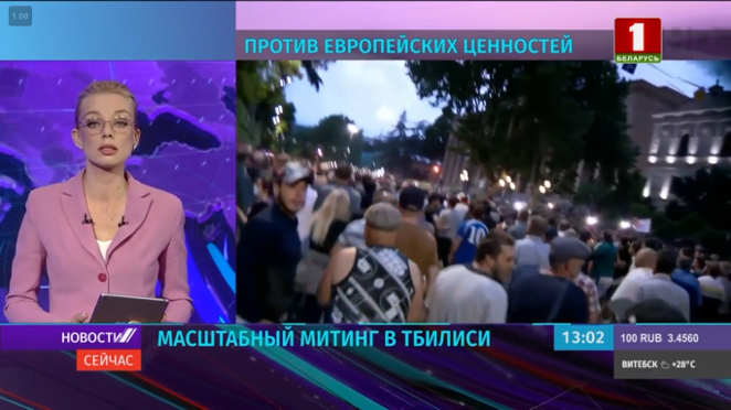 5 июля «Беларусь 1» показал сюжет с названием «Грузия отстаивает традиционные ценности». В нем ведущая обвинила грузинских журналистов в пропаганде нетрадиционных ценностей. По мнение автора видео, именно за это они были избиты противниками ЛГБТ. Кстати, как писало русскоязычное грузинское издание Sova, в общей сложности пострадали 53 сотрудника СМИ. Один из них – оператор телеканала TV Pirveli Лексо Лашкарава – впоследствии скончался.