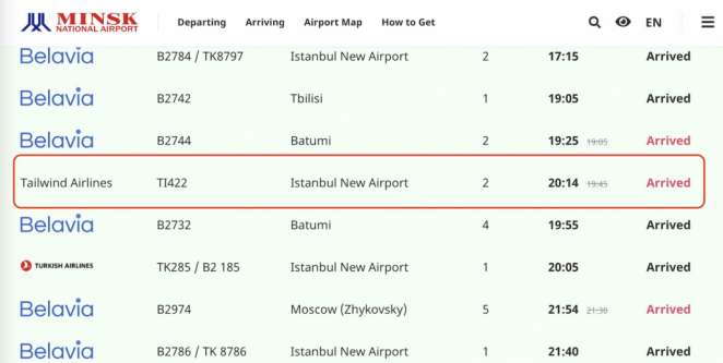 Данные подтверждаются сервисом Flightradar24. Сервис сообщает, что рейс TI422 вылетел из аэропорта Стамбула (IST) в 2:43 pm UTC и прилетел в Минск в 5:13 pm UTC. В тот же день, до полета в Минск, борт совершил еще один перелет — из Эрбиля (EBL) в Стамбул, причем пауза между полетами составила 1 час 3 минуты. Рейс «Эрбиль — Стамбул» также имел номер TI422.
