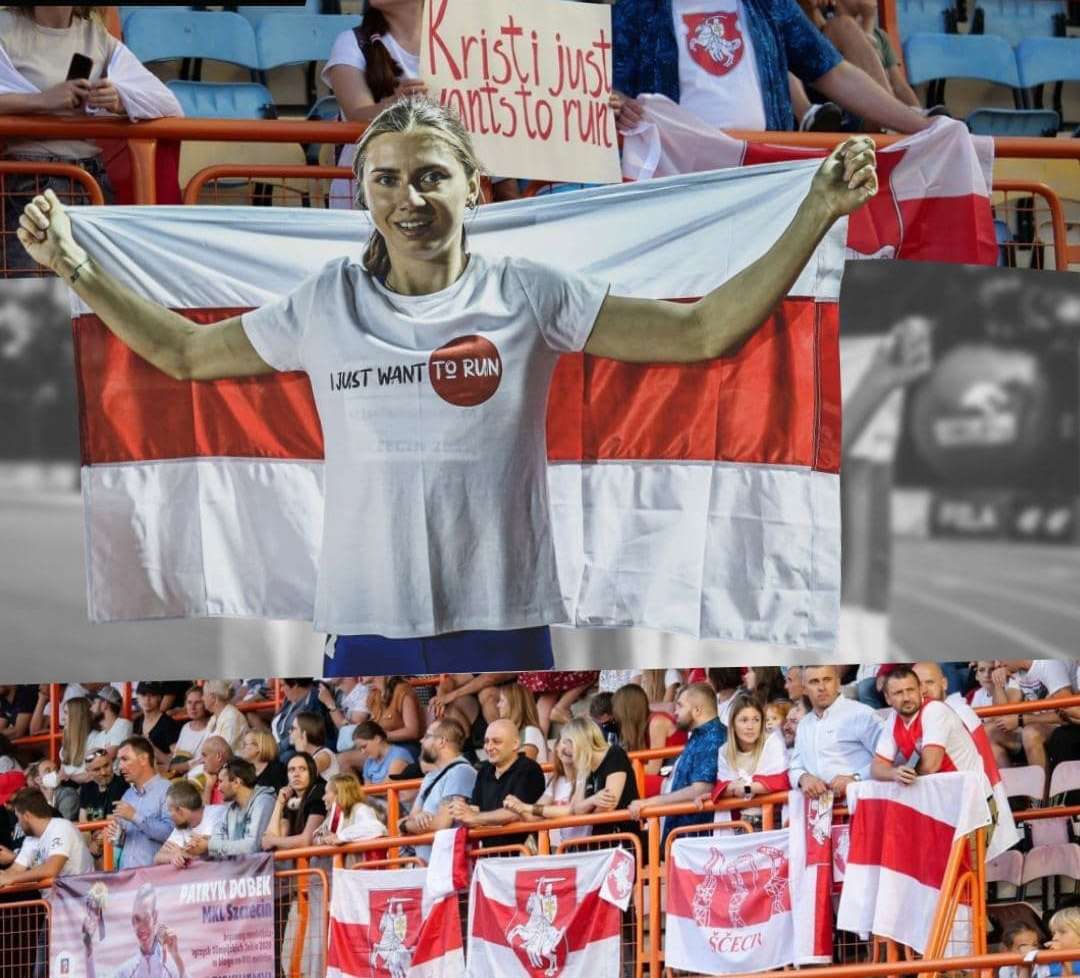 Появились фотографии легкоатлетки с БЧБ-флагом и белорусов, которые поддержали спортсменку на соревнованиях в Щецине.