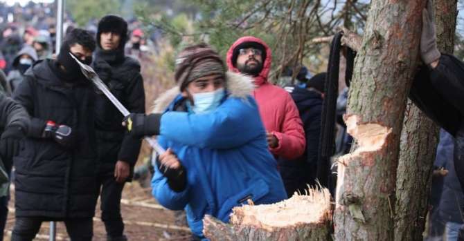 Мигранты рубят деревья возле белорусско-польской границы