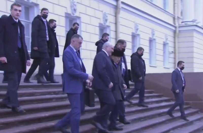 Затем был опубликовано видео, как лидеры страны СНГ выходят с заседания. Правитель Беларуси вышел с младшим сыном Николаем и помог престарелому Нурсултану Назарбаеву спуститься по лестнице.