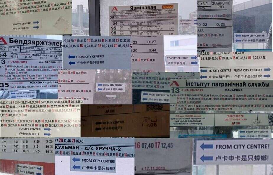 На десятках остановок Минска появились наклейки со стрелками и с надписями по-английски «центр города там» и надписью по-китайски рядом.
