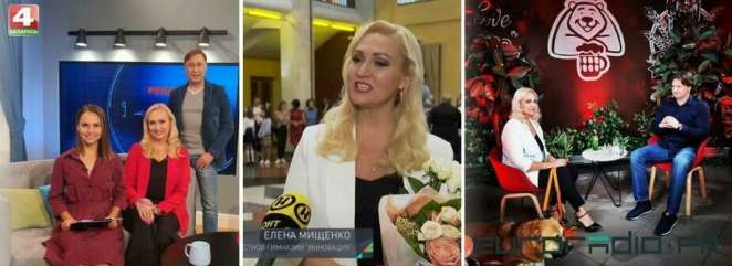 Слева направо: Елена Мищенко в репортаже «Беларусь 4», на ОНТ и с Эдгардом Запашным