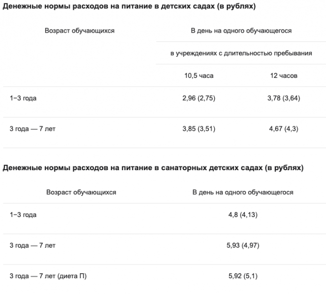 В таблицах приведены денежные нормы расходов на питание, которые будут действовать с 21 января (в скобках — те, которые действуют сейчас). Уточним, что мы прописали в таблицах новые возрастные категории.