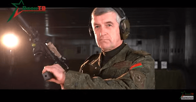 ВоенТВ показало, как белорусский генерал стреляет по мишеням из пистолета для стрельбы холостыми