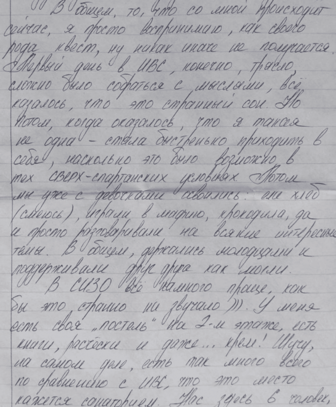 «Первый день в ИВС трясло. Не могла собраться с мыслями. В СИЗО все намного проще, как бы это ни звучало. У меня есть своя «кровать» на втором этаже, книги, расческа и даже… крем! Шучу, что по сравнению с ИВС здесь столько всего, что это место кажется санаторием», — пишет женщина в письмах.
