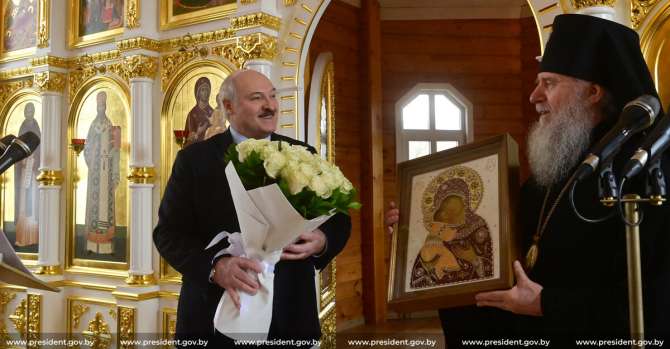 Политик приехал в храм вместе со своим младшим сыном Николаем. У церкви его встретили архиепископ Витебский и Оршанский Димитрий и настоятель храма протоиерей Сергий.