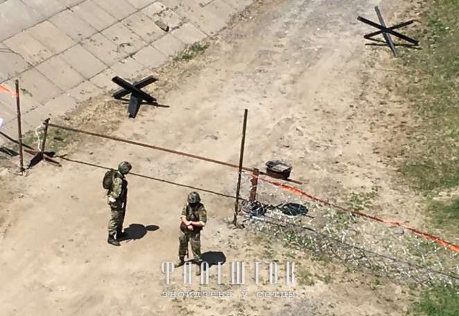 Солдаты с автоматическим оружием оцепили территорию под мостом с помощью колючей проволоки и красной ленты, привезли два противотанковых ежа и стерегут импровизированный шлагбаум. Под мостом поставили палатку.