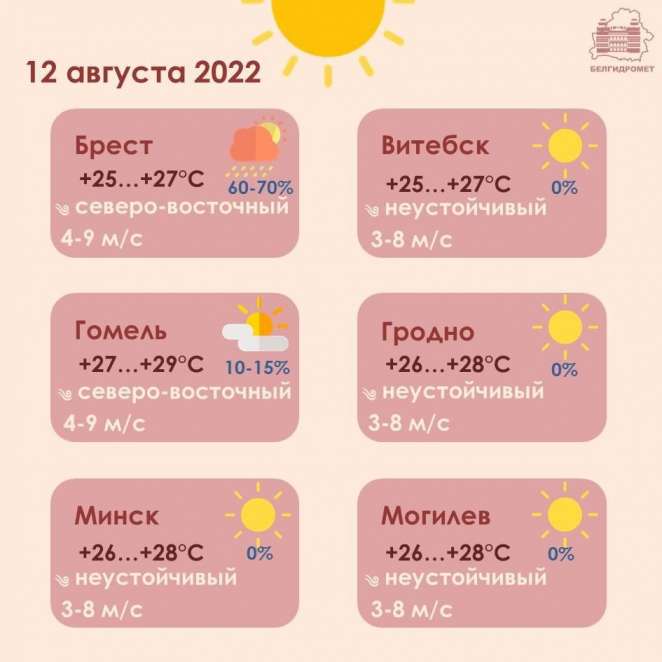 В ночные часы температура воздуха составит от +9 до +15 (в Минске — от +12 до +14, на юге — до +18 градусов), в дневные часы — 24-30 тепла (в столице — от +26 до +28).
