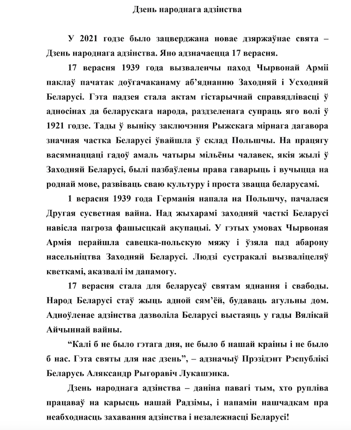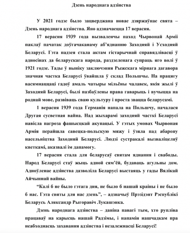 «17 сентября 1939 года освободительный поход Красной армии положил начало длительному объединению Западной и Восточной Беларуси. Это событие стало актом исторической справедливости в отношении белорусского народа, расчлененного против его воли в 1921 году. Тогда в результате заключения Рижского мирного договора значительная часть Беларуси вошла в состав Польши. В течение восемнадцати лет почти четыре миллиона человек, живших в Западной Беларуси, были лишены права говорить и учиться на родном языке, развивать свою культуру и просто называться белорусами».