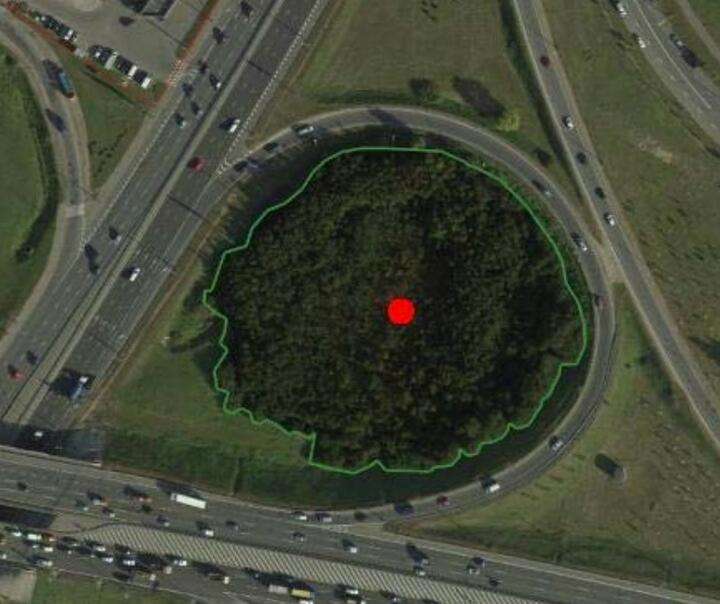 Болото находится в необычном месте: у пересечения МКАД и трассы на Брест, причем в буквальном смысле на перекрестке — в одном из «лепестков» дорожной развязки. Это круглый участок площадью 1,28 гектара.