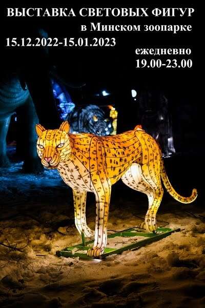 На территории Минского зоопарка установили световые фигуры животных, выполненные из шелковой ткани и подсвеченные изнутри многочисленными лампочками, а также движущиеся фигуры зверей Африки, подсвеченные снаружи. Выставка разделена на три зоны различных видов животных.