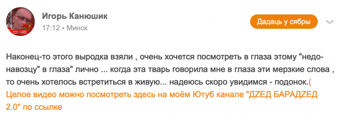 Известно, что с его подачи был задержан 23-летний Роман Сафонов из Витебска. Видео с парнем на канале Канюшика вышло 1 декабря. На нем тот выглядит нетрезвым и в конце разговора говорит провокатору, что он якобы «боец Азова» и «будет спать с его дочерью». После этого к парню пришел ГУБОПиК.