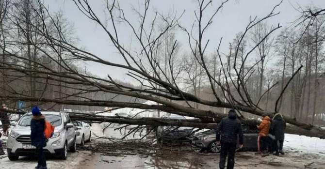 Дерево упало на легуковушку в Раубичах. 19 февраля 2023 года. Фото: БЕЛТА