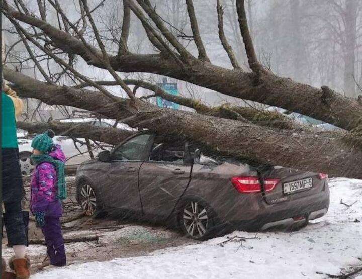 В Раубичах ветер снес дерево прямо на припаркованную легковушку