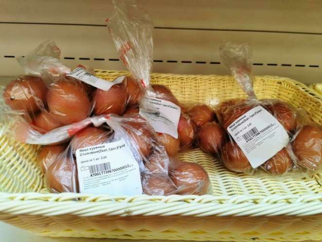 Если взять и яйца, и лоток, то покупатель платит 2,59 рубля. Если брать такие же яйца, но в пакете, они будут стоить 2,45 рубля.