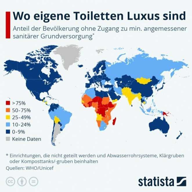 Например, в Эфиопии только 9% жителей имели доступ к соответствующим системам, на Мадагаскаре и в Республике Чад — по 12%. Пустыня Сахара обычно представляет собой демаркационную линию по доступу к частным туалетам: например, в Ливии и Египте такими благами могли пользоваться 92 и 97% населения соответственно.