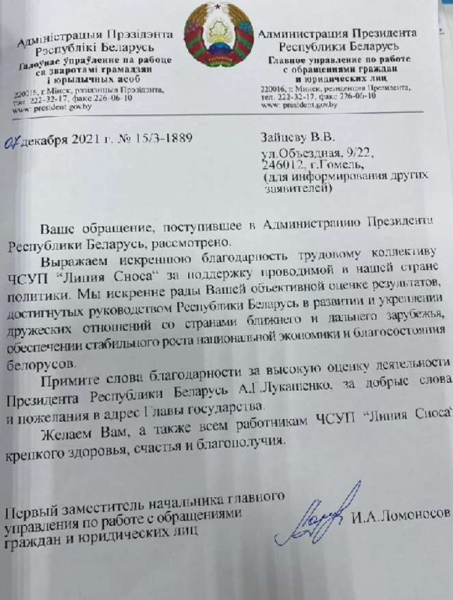 Из документов, представленных в видеоролике, следует, что ЧСУП «Линия Сноса» перечисляла средства в избирательный фонд Лукашенко и даже разработала в его поддержку свой агитационный плакат.