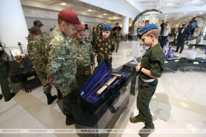 Во время экскурсии во Дворец Независимости воспитанникам «военно-патриотического» центра спецподготовки «Скиф» из Речицы и областного военно-патриотического клуба «Доблесть» войсковой части 3310 показали экспонаты, размещенные в коридорах. Фото опубликовало государственное пропагандистское информагентство БЕЛТА.