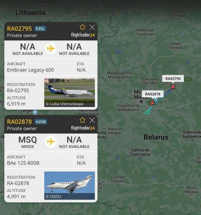 В 22.39 Embraer Legacy 600 (рег. номер RA-02795) взлетел с военного аэродрома Мачулищи и направился в сторону России.