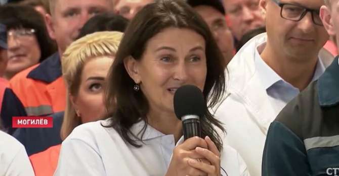 Работница «Могилевлифтмаша» зачитывает Лукашенко свое стихотворение, 10 июля 2023 года. Скриншот видео СТВ