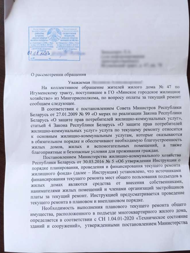 В письме, которое пришло от Минского городского жилищного хозяйства в ответ на обращение жильцов, говорится, что, учитывая фактическое состояние мест общего пользования, подъезд №3 в жилом доме №47 по Игуменскому тракту (в полном объеме) включен в программу текущего ремонта ЖКХ Ленинского района на I квартал 2023 года. Далее приводим цитату: «за нарушения в организации ремонта (ненадлежащее информирование, необоснованное уменьшение запланированных объемов работ, незаключение договоров с собственниками и нанимателями жилых помещений на выполнение текущего ремонта) инженер ГП ЖЭУ 4, присутствовавший на собрании 9.02.2023, депремирован по итогам работы за июнь 2023 года. Привлечь к ответственности инженера производственного отдела КУП «ЖКХ Ленинского района», также присутствовавшего в ходе данного собрания, не представляется возможным по причине расторжения с ним трудовых отношений. Одновременно сообщаем, что жителями указанного подъезда информация о получении согласия простого большинства на выполнение работ по укладке плитки в ГП ЖЭУ 4 не предоставлена».