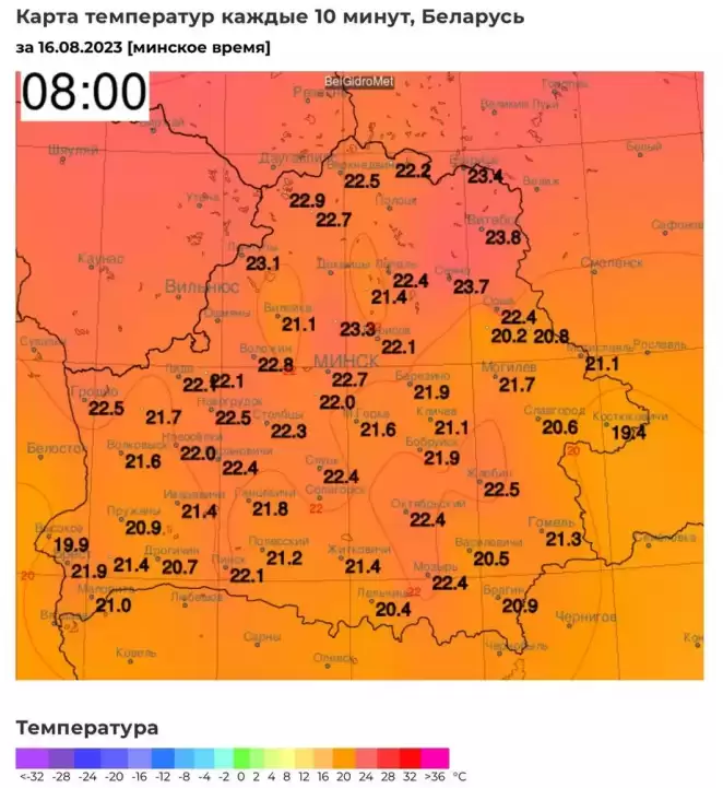 «Холоднее» всего в окрестностях южного Бреста — +19,9°с, а теплее всего на самом севере Беларуси — в Езерище — +23,4°С.