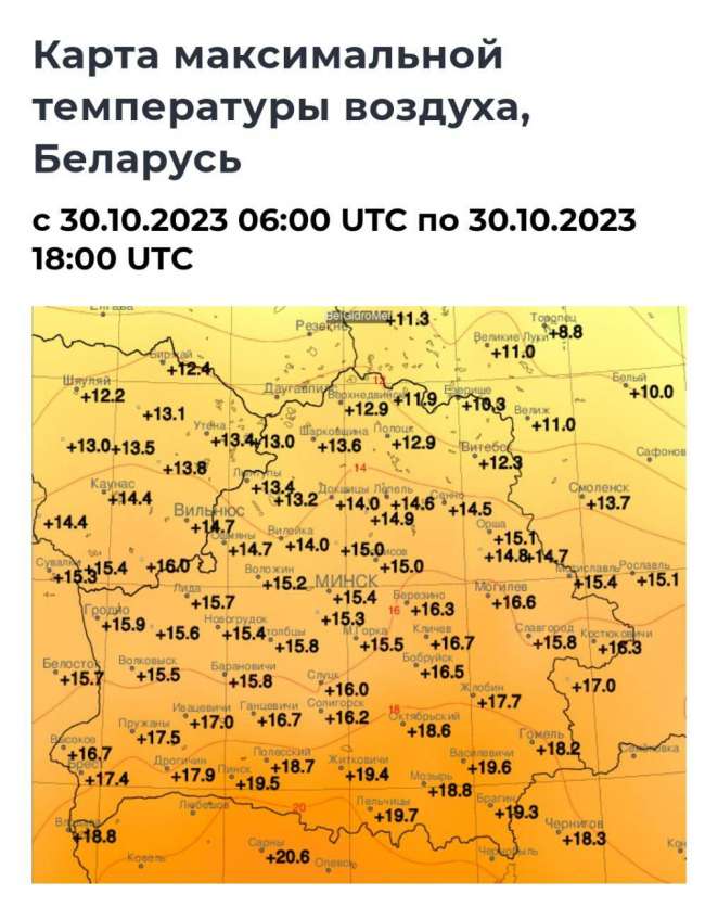 Так, 30 октября в Минске был побит температурный рекорд 127-летней давности — воздух прогрелся до +15,4°С (предыдущий максимум в +15°С был зафиксирована в далёком 1896 году, свидетельствуют данные справочно-информационного портала «Погода и климат».
