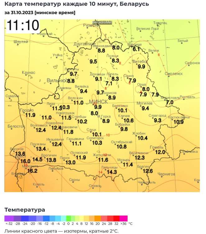 Как отметили авторы телеграм-канала о погоде «Надвор’е», во вторник, 31 октября, тропический воздух продолжил поступать на территорию Беларуси. Однако, в отличие от предыдущего солнечного дня, сейчас прогреву солнцем препятствует плотная облачность фронтов. Впрочем, исключать новых рекордов, с учётом того, что аномальное тепло держится уже не первый день, нельзя — уже к 11:00 воздух в Малорите прогрелся до +16,2°С, в Бресте — до +16,0°С.