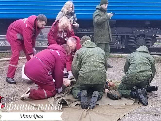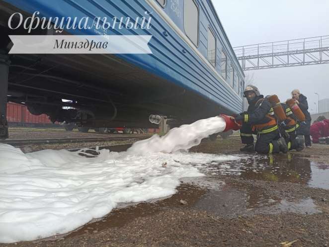 «По легенде, на ж/д путях загорелся вагон, в котором ехали военные. Их роли играют курсанты БГМУ. На учениях задействованы специалисты Беларусской железной дороги, МЧС, МВД, скорой медицинской помощи и больницы скорой медицинской помощи», – сообщили в Минздраве.