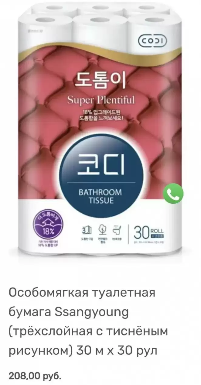 На сайте одного белорусского-интернет магазина эта бумага южнокорейского бренда SY CODI-LUXE стоит чуть дороже, чем в оффлайн-магазине — 186 рублей за упаковку 30 рулонов по 30 метров (в магазине — 183 рубля). Получается, по 6 рублей 20 копеек за рулон. Для сравнения: обычная туалетная бумага в минских магазинах продается примерно по цене от 47 копеек до 1 рубля 75 копеек за рулон.