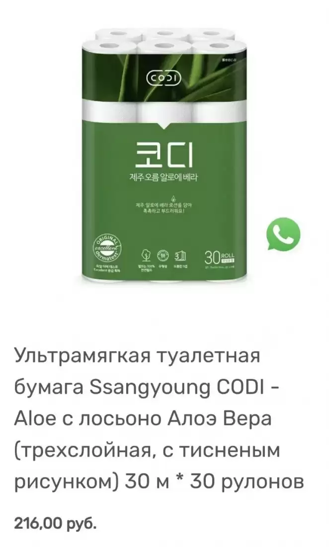 Но можно и шикануть и заказать что-то из самых дорогих вариантов, которые стоят более 200 рублей. Это особомягкая туалетная бумага Ssangyoung (208 рублей за упаковку, или 6,9 рубля за рулон) и ультрамягкая бумага с лосьоном алоэ вера (216 рублей за упаковку, или 7,2 рубля за рулон). Про первую написано, что она состоит из натуральной целлюлозы на 26% и на 74% из переработанной. О второй указано, что она получила наивысший балл в Институте дерматологических исследований (Германия) и рекомендована для самой чувствительной кожи.