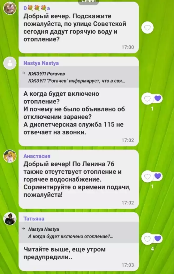 К вечеру в квартирах стало довольно холодно, и жильцы отключенных домов стали интересоваться в вайбер-чате Рогачевского райисполкома, когда будет восстановлено теплоснабжение.
