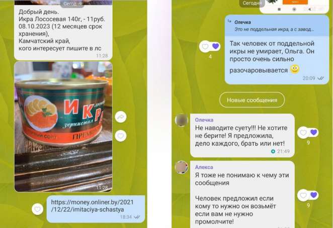 Но самые безудержные продавцы ненастоящего — в интернете. Там даже не напрягаются с ИП или ООО, чтобы имитировать счастье по 10 рублей. Недавняя история: субботним вечером некая «Олечка» принесла в дачный чат красивые банки — 11 рублей, 140 граммов, производитель — «Камчатский край».
