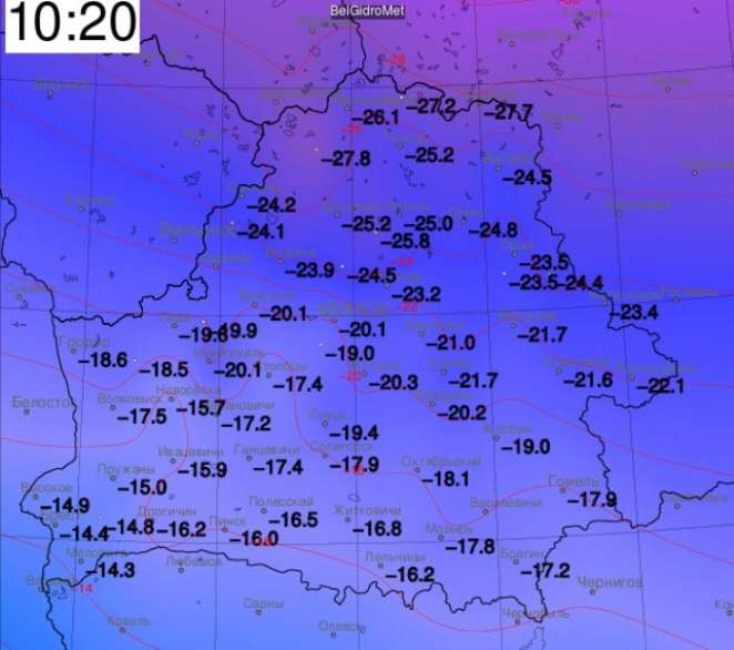 Самая низкая температура зафиксирована в -28°C на севере страны, а самая высокая – в -13.3°C на юго-западе.