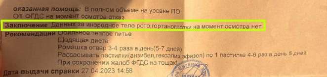 На следующий день, по словам Натальи, у нее разболелось горло. Она обратилась в больницу. Ее осмотрели и выдали справку, в которой, кстати, не сказано ничего криминального: инородное тело в горле не обнаружено.