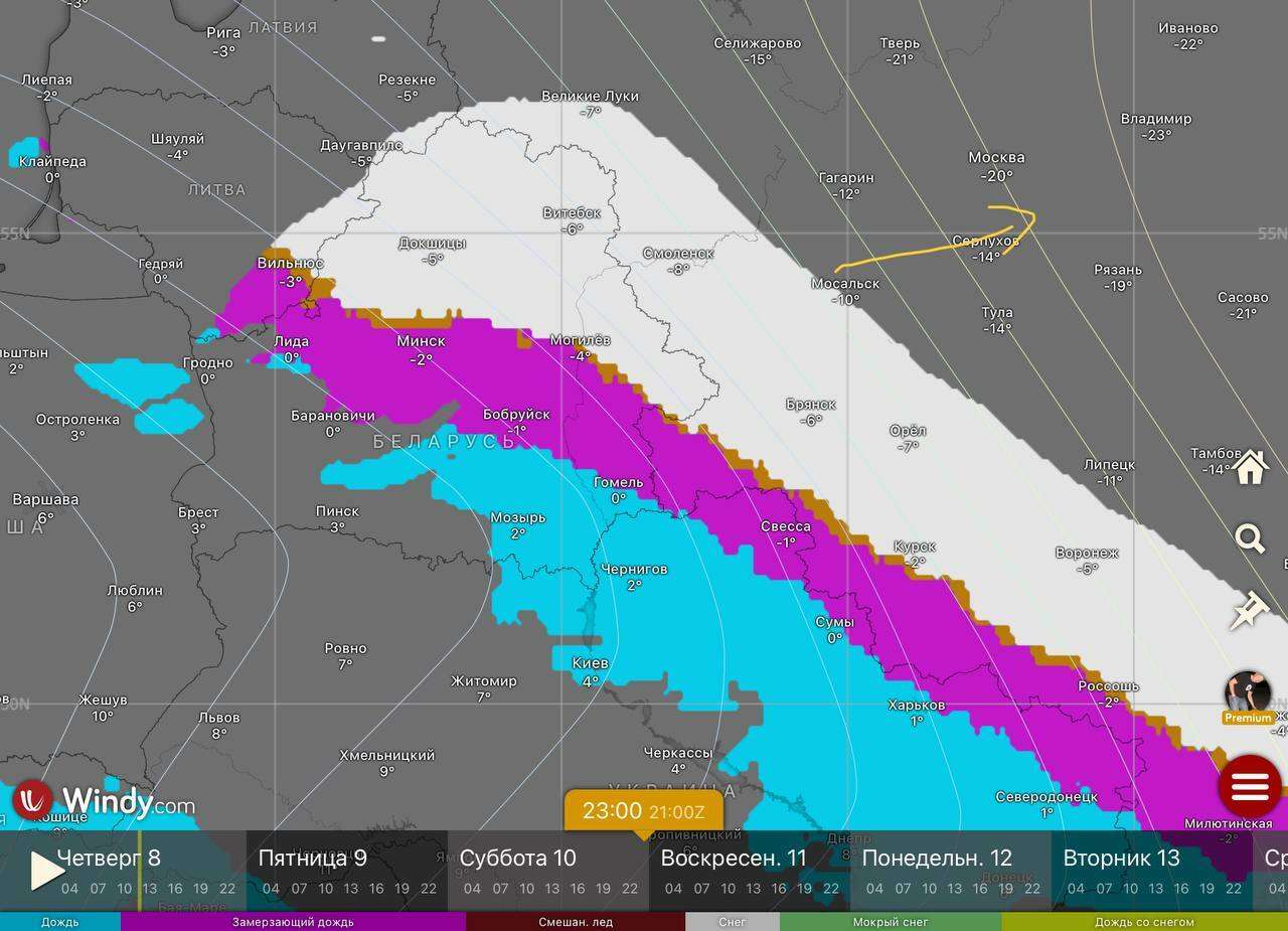 Численная модель ECMWF, по словам авторов телеграм-канала о погоде «Надвор’е», «прогнозирует веселье» в центральных районах Беларуси, а с вечера субботы и ночью воскресенья на территории страны будет наблюдаться «довольно широкая зона гололёда».