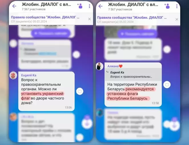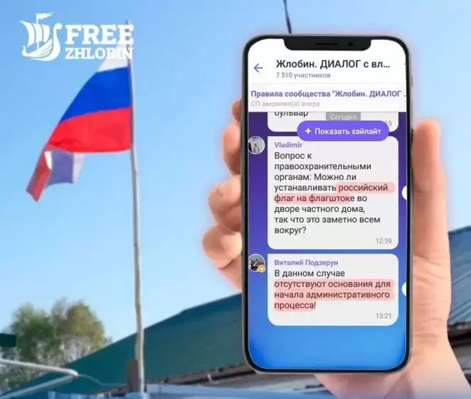 Еще 5 февраля «Свободный Жлобин» сообщал, что в местном чате «Диалог с властью» граждане задавали вопрос, можно ли ставить на подворьях российские флаги, так как такие случаи уже были зафиксированы. Им ответил лично начальник местного РОВД Виталий Подзерун: