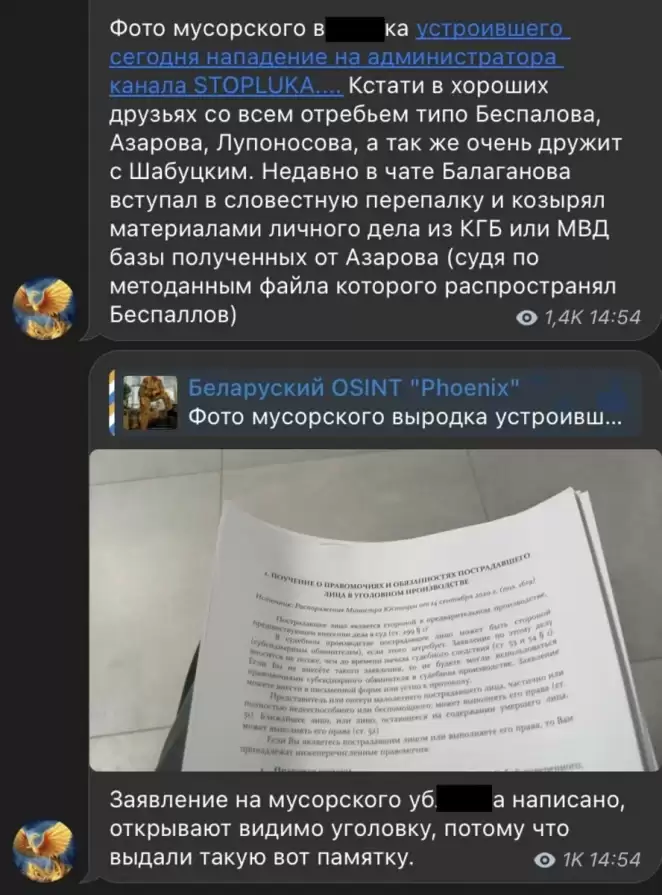 Скриншоты переписки журналиста «Нашай Нівы» и Дмитрия сразу после обращения были опубликованы в канале Кондратенко — OSINT «Феникс», а с него перекочевали в белорусские провластные каналы.