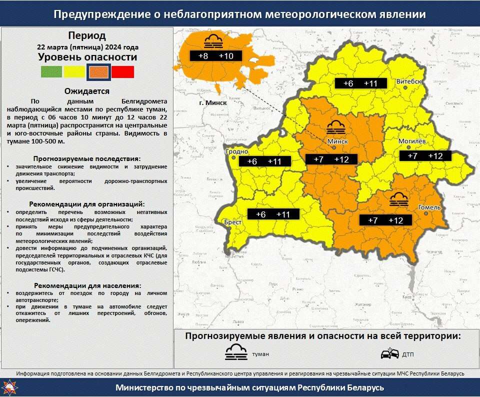По данным Белгидромета, наблюдающийся местами по страны туман 22 марта ориентировочно в промежутке с 6:10 до 12:00 «распространится на центральные и юго-восточные районы страны». Для Минска на этот период прогноз по туману дали «умеренный, предупредив, что видимость на дорогах может снизиться до 100-500 метров.