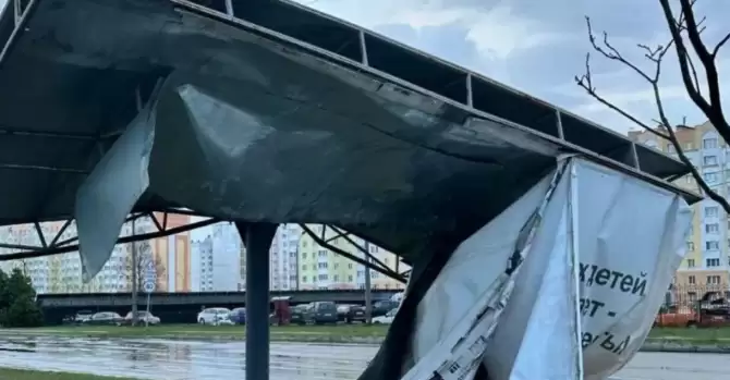 В городе прошла песчаная буря и гроза. При этом сильный ветер выворачивал деревья, рекламные щиты и ларьки.