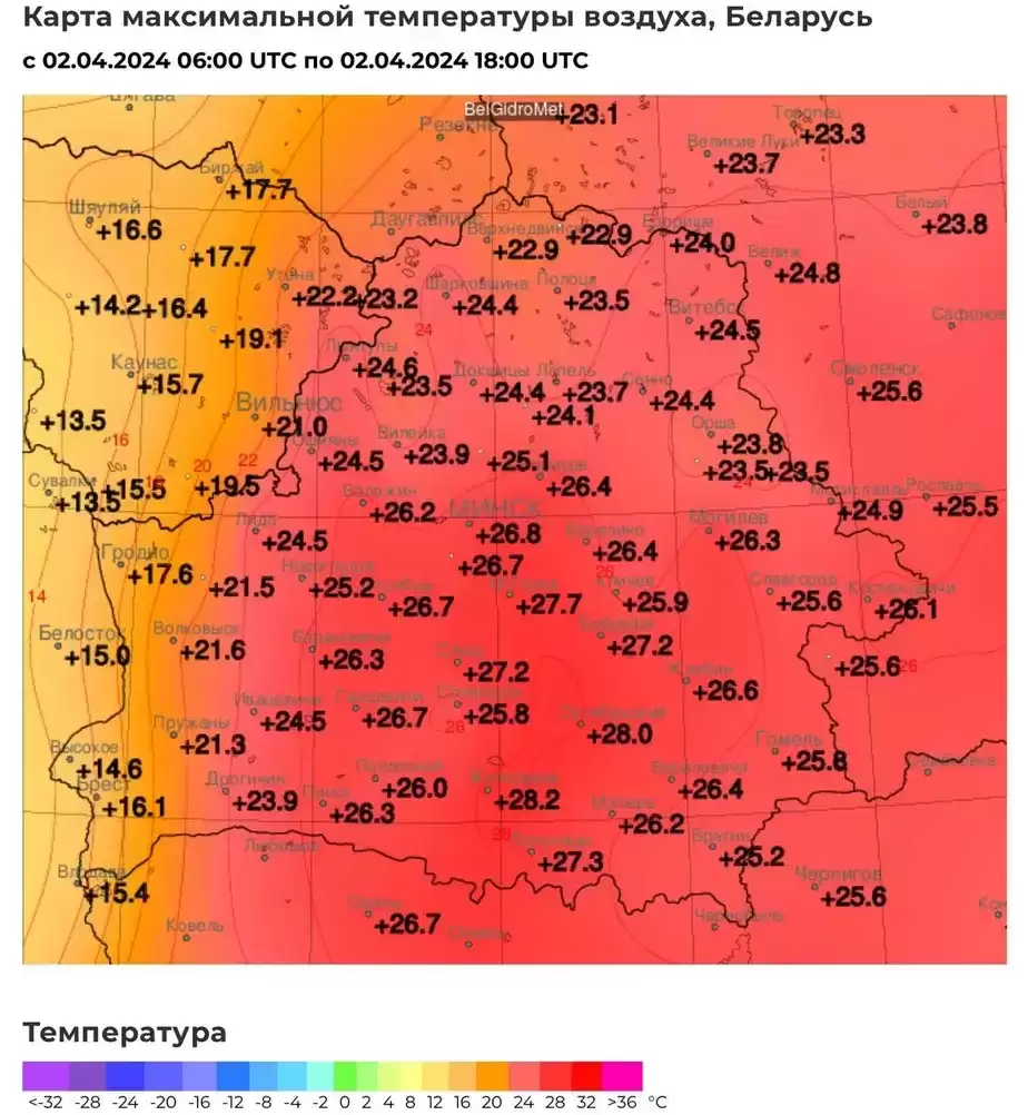 В Минске было +26,8°С, в Витебске +25°С, даже в «белорусском Оймяконе» Езерище — +24°С.