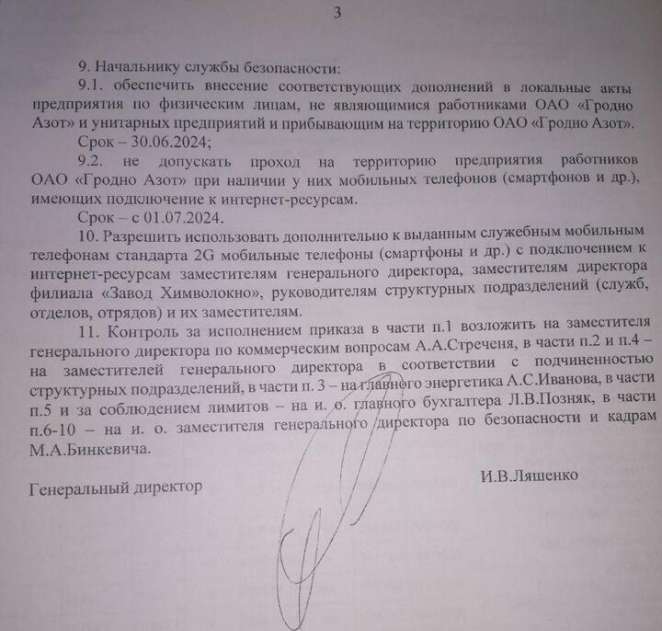 Третья (последняя) страница приказа о запрете использования смартфонами на территории «Гродно Азота»