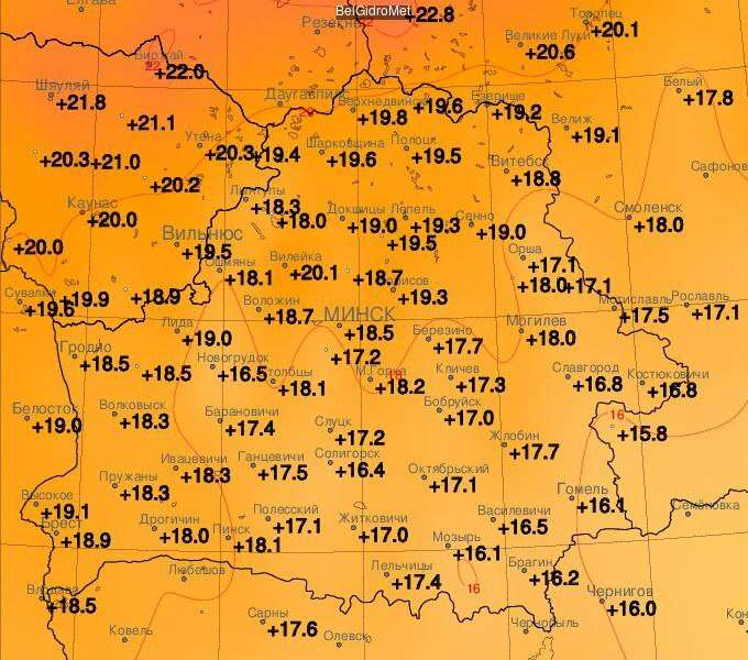 В последнее время дневные максимумы в Беларуси не превышали 20°С. Примечательно, что в последние дни на севере страны теплее, чем на юге. Так, самой тёплой точкой страны в среду, 15 мая, судя по данным Белгидромета, был Верхнедвинск в Витебской области — там воздух прогрелся днём до +19,8°С.