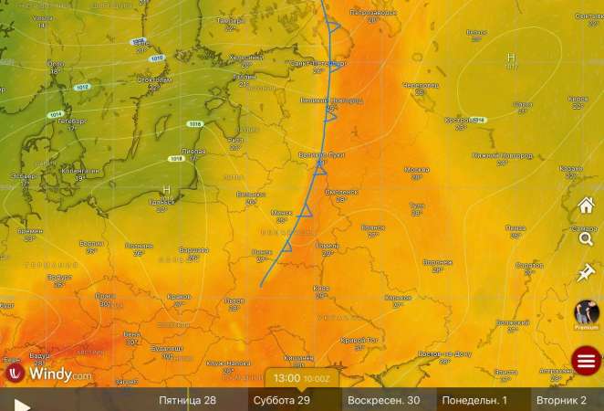 По данным Telegram-канала Nadvorie, холодный фронт придёт в Беларусь уже в субботу, 29 июня. Согласно прогнозу ECMWF, температура опустится до +25..+27°С, а по линии фронта, которая должна пересечь страну с севера на юг, пройдут ливни с грозами.