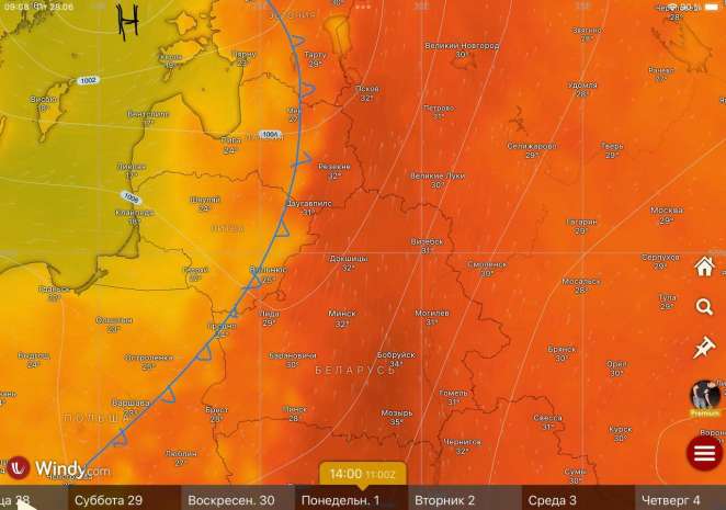 На воскресенье, 30 июня, Белгидромет спрогнозировал приход «очень теплой воздушной массы». Даже ночью температура воздуха не будет опускаться ниже +13..+20°С, а днём, по прогнозам, перевалит за +26..+33°С.