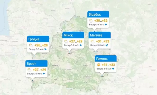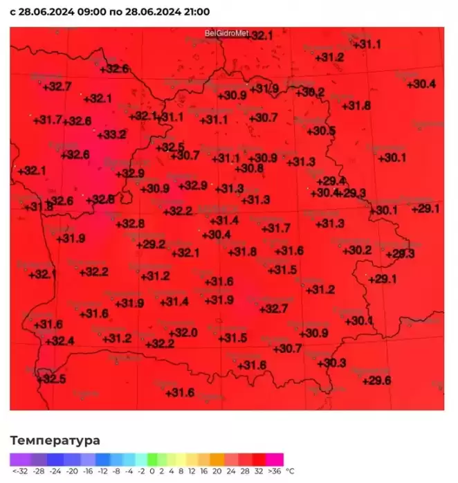 В Минске было +31,4°C, в Бресте +32,5°C, в Гродно +31,9°C, в районе пограничного перехода «Каменный Лог» на литовской границе +32,5°C.