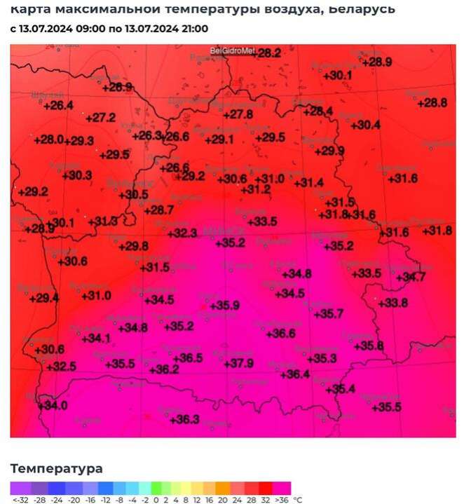 Температура воздуха в Беларуси 13 июля достигла максимального уровня для этого месяца, зафиксированного за всю историю метеонаблюдений. Карту температур за субботу опубликовал телеграм-канал «Надвор’е».